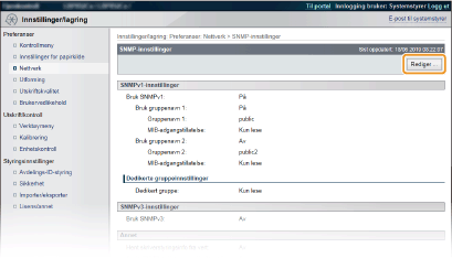 Hvis begge versjoner av SNMP er aktivert, anbefales det at MIB-tilgangstillatelsen i SNMPv1 angis til [Kun lese]. MIB-tilgangstillatelsen kan angis uavhengig i SNMPv1 og SNMPv3 (og for hver bruker i SNMPv3). Ved å velge [Lese/skrive] (full tilgangstillatelse) i SNMPv1 oppheves de robuste sikkerhetsfunksjonene som er et kjennetegn i SNMPv3, fordi de fleste av maskininnstillingene dermed kan kontrolleres med SNMPv1. |