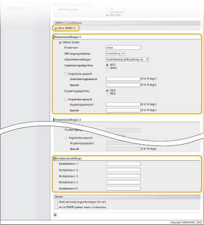 Simple Network Management Protocol (SNMP) er en protokoll for å overvåke og kontrollere kommunikasjonsenheter på et nettverk ved å bruke Management Information Base (MIB). Maskinen støtter SNMPv1 og SNMPv3 med forbedret sikkerhet. Du kan kontrollere statusen for maskinen fra en datamaskin når du skriver ut dokumenter, eller du kan bruke Fjernkontroll. Du kan aktivere SNMPv1 eller SNMPv3, eller begge deler samtidig. Angi innstillingene for hver versjon slik at de passer til nettverksmiljøet og bruksformålet.