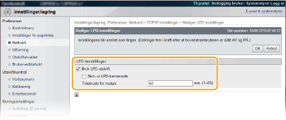 2 | Konfigurer innstillingene etter behov. ![]() [Bruk LPD-utskrift] Når du bruker LPD for utskrift, velger du avkrysningsboksen. Når du ikke bruker LPD, fjerner du merket i boksen. [Skriv ut LPD-bannerside] Velg avkrysningsboksen for å skrive ut informasjon, slik som brukernavn og filnavn, på utskrifter. Når du ikke skal skrive ut, kan du fjerne merket i boksen. [Tidsbrudd for mottak] Still inn tiden før utskriftsjobben automatisk avsluttes når utskriftsdata ikke kan mottas på grunn av en kommunikasjonsfeil eller et annet problem. |