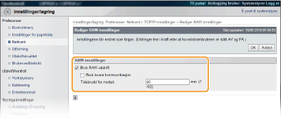 2 | Konfigurer innstillingene etter behov. ![]() [Bruk RAW-utskrift] Når du bruker RAW for utskrift, velger du avkrysningsboksen. Når du ikke bruker RAW, fjerner du merket i boksen. [Bruk toveis kommunikasjon] Når du bruker toveis kommunikasjon for å varsle datamaskinen om maskinstatus og fullførelse av utskrifter, velger du avkrysningsboksen. Når du ikke bruker toveis kommunikasjon, kan du fjerne merket i boksen. [Tidsbrudd for mottak] Still inn tiden før utskriftsjobben automatisk avsluttes når utskriftsdata ikke kan mottas på grunn av en kommunikasjonsfeil eller et annet problem. |