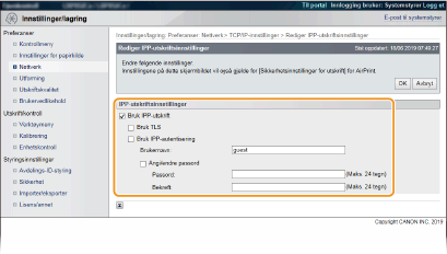 2 | Konfigurer innstillingene etter behov. ![]() [Bruk IPP-utskrift] Når du bruker IPP/IPPS for utskrift, velger du avkrysningsboksen. Når du ikke bruker IPP/IPPS, fjerner du merket i boksen. [Bruk TLS] Når du bruker IPPS (IPP-utskrift med TLS-kryptert kommunikasjon), velger du avkrysningsboksen. Når du ikke bruker IPPS, fjerner du merket i boksen. ![]() Når du bruker IPPS må du aktivere funksjonen for TLS-kryptert kommunikasjon. Bruke TLS for kryptert kommunikasjon ![]() Hvis du velger [RSA] for [Nøkkelalgoritme] ved generering av nøkkelen som skal brukes til nettverkskommunikasjon, må du stille inn en nøkkellengde på [1024-bit] eller lengre. Det kan hende at IPPS-utskrift ikke kan utføres på korrekt måte hvis en nøkkellengde på [512-bit] stilles inn, avhengig av hvilket operativsystem du bruker. [Bruk IPP-autentisering] Når du bruker funksjonen for brukerautentisering for IPP-utskrift, velger du avkrysningsboksen og angir brukernavnet og passordet. Når du ikke bruker den, fjerner du merket i boksen. [Brukernavn] Angi alfanumeriske tegn for brukernavnet som brukes ved IPP-autentisering. [Angi/endre passord] Når du vil angi eller endre passord, merker du av i avkrysningsboksen og skriver inn alfanumeriske tegn for passordet i tekstboksen [Passord]. Bekreft passordet ved å skrive det inn på nytt i tekstboksen [Bekreft]. |