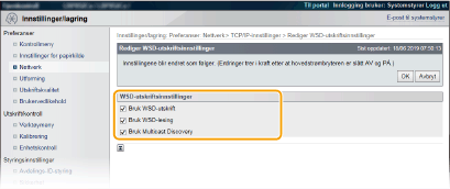2 | Konfigurer innstillingene etter behov. ![]() [Bruk WSD-utskrift] Når du bruker WSD for utskrift, velger du avkrysningsboksen. Når du ikke bruker WSD, fjerner du merket i boksen. [Bruk WSD-lesing] Velg avkrysningsboksen for å få informasjon om maskinen fra en datamaskin via WSD. Denne avkrysningsboksen velges automatisk når [Bruk WSD-utskrift]-avkrysningsboksen velges. [Bruk Multicast Discovery] Merk av i boksen for å angi at maskinen skal svare på meldinger om multikastoppdaging. Hvis merket er fjernet, blir maskinen værende i dvalemodus selv når meldinger om multikastoppdaging ligger ute på nettverket. |