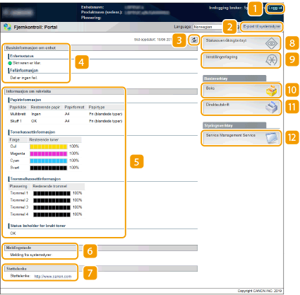 Viser informasjon om papiret (gjenværende mengde, format, osv.) og status for tonerkassettene og annet forbruksmateriell.