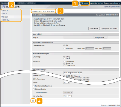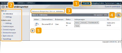 Viser [Statusovervåking/avbryt]-siden. Du kan bruke denne siden til å kontrollere gjeldende utskriftsstatus, avbryte utskriftsprosessen og vise en historikk over utskriftsjobber.