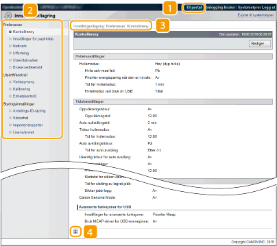 Viser siden [Innstillinger/lagring]. Når du er logget på i administrasjonsmodus, kan du endre innstillingsalternativene og lagre / laste inn registrerte data.