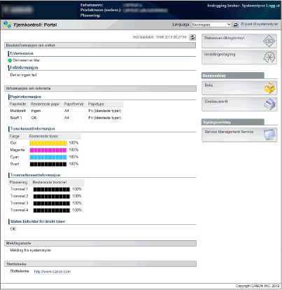For ekstern betjening må du angi IP-adressen til maskinen i en nettleser og starte Fjernkontroll. Kontroller IP-adressen som er angitt på maskinen, på forhånd (