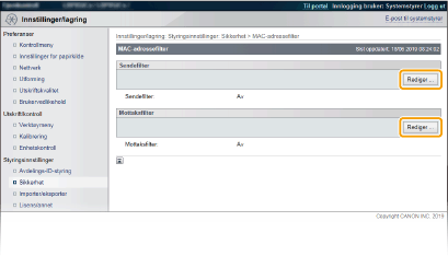 1 | Merk av for [Bruk filter], og klikk på alternativknappen [Tillat] eller [Avvis] for [Standardpolicy]. [Bruk filter] Merk av i boksen hvis du vil begrense kommunikasjon. Fjern merket i boksen hvis du vil deaktivere begrensningen. [Standardpolicy] Velg forutsetningen for å tillate eller avvise andre enheter å kommunisere med maskinen. [Tillat] | Velg å blokkere kommunikasjonspakker når de sendes til eller mottas fra enheter der MAC-adressene er angitt i [Unntaksadresser]. Kommunikasjon med andre enheter er tillatt. | [Avvis] | Velg å sende kommunikasjonspakker bare når de sendes til eller mottas fra enheter der MAC-adressene er angitt i [Unntaksadresser]. Kommunikasjon med andre enheter er forbudt. |