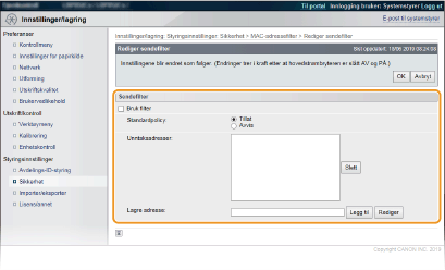 Du trenger ikke skille adressene med bindestreker eller kolon. Kontroller om det finnes inntastingsfeil Hvis MAC-adresser blir angitt feil, kan det hende at du ikke får tilgang til maskinen fra Fjernkontroll. I så fall må du angi <Adressefilter> til <Av>. Adressefilter Når du har valgt [Avvis] under [Standardpolicy] Utgående flerkastings- og kringkastingspakker kan ikke filtreres. Slette en MAC-adresse fra unntak Velg en MAC-adresse, og klikk på [Slett]. |