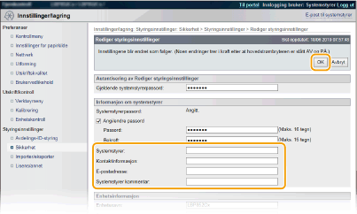 Du trenger administrative rettigheter for å endre innstillingene som er konfigurert i maskinen fra Fjernkontroll. Følg fremgangsmåten under for å endre systembehandlerpassordet. Informasjon om innstillinger for systembehandlerpassordet er viktig for maskinens sikkerhet, og du bør derfor påse at bare administratorer kjenner til systembehandlerpassordet.