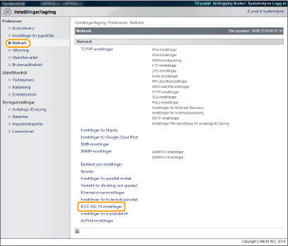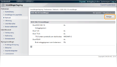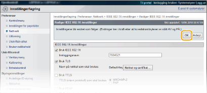 Bruke betjeningspaneletDu kan også aktivere eller deaktivere IEEE 802.1X-autentisering via innstillinger-menyen på betjeningspanelet. IEEE802.1X |