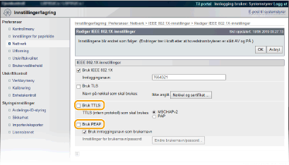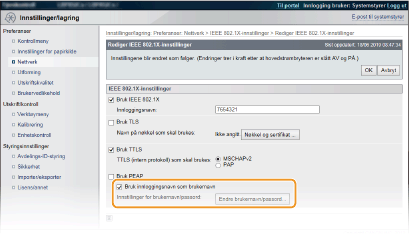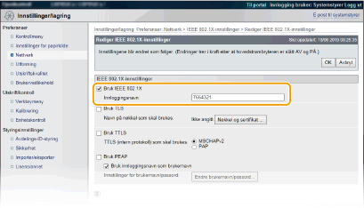 Merk av for [Bruk IEEE 802.1X], skriv inn påloggingsnavnet i tekstboksen [Innloggingsnavn], og angi de obligatoriske innstillingene.
