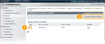2 | Velg en nøkkel fra listen over nøkler og sertifikater, og klikk på [Standard nøkkelinnstillinger]. Vise detaljer for et nøkkelpar eller sertifikat |