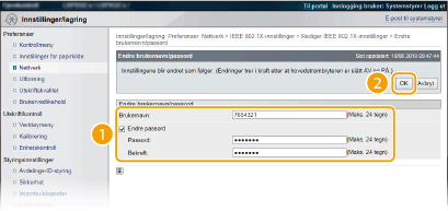 3 | Angi brukernavnet/passordet, og klikk på [OK]. [Brukernavn] Skriv inn alfanumeriske tegn for brukernavnet. [Endre passord] Hvis du vil angi eller endre passordet, krysser du av i boksen og taster inn alfanumeriske tegn for det nye passordet både i tekstboksen [Passord] og i tekstboksen [Bekreft]. |