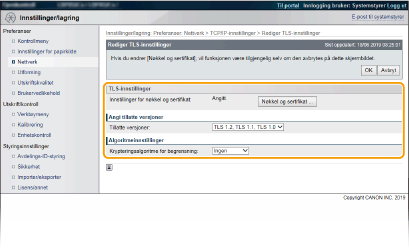 Du kan kryptere kommunikasjon mellom maskinen og en nettleser på datamaskinen og IPP-utskriftsdataene som skal skrives ut på Internett ved bruk av Transport Layer Security (TLS). TLS er en mekanisme for å kryptere data som sendes eller mottas over nettverket. TLS må være aktivert når Fjernkontroll brukes for å angi innstillinger for IPSec (forhåndsdelt nøkkelmetode), IEEE 802.1X-autentisering (TTLS/PEAP) eller SNMPv3. For å bruke TLS-kryptert kommunikasjon må du angi et nøkkelpar og aktivere TLS-funksjonen. Ha et nøkkelpar klart til bruk (