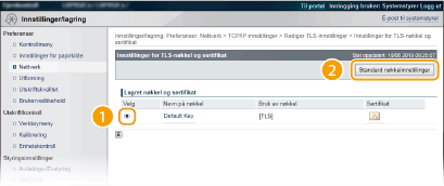 Velg en nøkkel fra listen over nøkler og sertifikater, og klikk på [Standard nøkkelinnstillinger].
