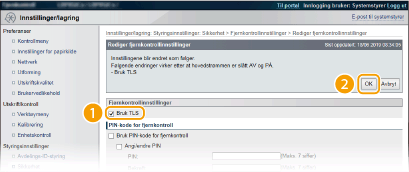 3 | Merk av for [Bruk TLS], og klikk på [OK]. [Bruk TLS] Ved bruk av TLS for Fjernkontroll, velger du avkrysningsboksen. Hvis ikke, fjerner du merket i boksen. |