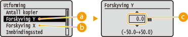 Du kan velge <Tilst. utskriftspos.> under <Brukervedlikehold> for å angi detaljer for utskriftsposisjonen til hver papirkilde. Du kan velge blant tilgjengelige forskyvningsverdier fra -5,0 mm til +5,0 mm i vertikal retning og fra -3,5 mm til +3,5 mm i horisontal retning. Juster utskriftsposisjon |