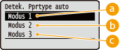 Hvis du angir <Modus 1>, kan du stille <Detek. Pprtype auto> inn til <Ikke bruk> for den papirkilden du ønsker å bruke. Detek. Pprtype auto Med <Modus 1> eller <Modus 2> angitt, brukes CMYK-tonere selv ved svart-/hvitt-utskrift, avhengig av papirtypen som brukes. Dermed kan utskriftshastigheten bli tregere. Med <Av> angitt, kan svart-/hvitt-utskrift resultere i ujevn utskriftshastighet. |