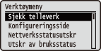 | Du kan vise det totale antallet utskrevne sider og intern systeminformasjon om utskrifter. Når du trykker på  (  ) på betjeningspanelet, vises verktøysskjermen. Du kan angi innstillingene under når maskinen er offline. |