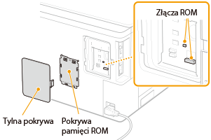 W tej części opisano, w jaki sposób zainstalować dodatkową pamięć ROM w urządzeniu. Pamięć ROM podłącza się do złączy ROM wewnątrz obudowy z tyłu urządzenia. Przed zainstalowaniem pamięci ROM, należy się zapoznać ze środkami ostrożności wskazanymi w części Instalacja. | ![]() |