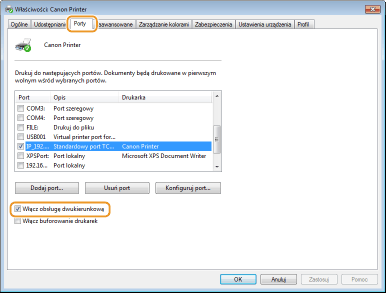 Na karcie [Porty] upewnij się, że pole wyboru [Włącz obsługę dwukierunkową] zostało zaznaczone.