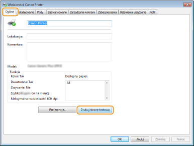Kliknij przycisk [Drukuj stronę testową] na karcie [Ogólne].