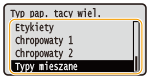 Jeśli użytkownik często zmienia typ ładowanego papieru, można wybrać ustawienie <Typy mieszane>, co eliminuje konieczność dostosowywania ustawienia typu papieru przy każdym drukowaniu. Należy jednak zwrócić uwagę na fakt, że ustawienie to powoduje, że urządzenie drukuje nawet wtedy, gdy ustawienie typu papieru w sterowniku drukarki nie zgadza się z typem papieru załadowanego do urządzenia.