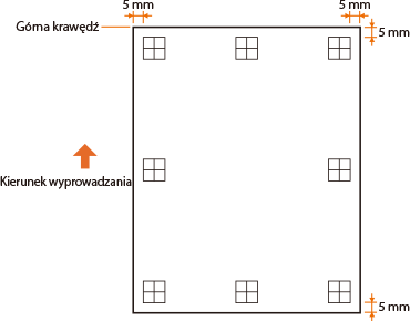 . Na podstawie tych oznaczeń należy wyznaczyć kierunek i odległość do wyregulowania. Jeśli położenie wydruku jest normalne, wszystkie oznaczenia zostaną wydrukowane w położeniu 5 mm od najbliższej krawędzi papieru.