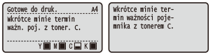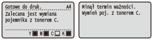 Kiedy wyświetlany jest komunikat <Minął termin ważności. Zalecana jest wymiana pojemnika z tonerem X.>, drukowanie zostaje tymczasowo zatrzymane. Aby wznowić drukowanie, naciśnij przycisk  (  ). To, który komunikat jest wyświetlany, zależy od ustawienia <Czynn. przy br. ton.> w menu ustawień w panelu sterowania. Czynn. przy br. ton. |
