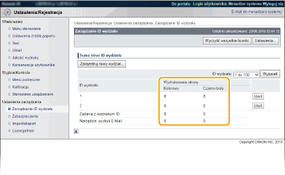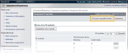 Drukowanie wyniku kontroliZerowanie licznika stronAby wyzerować licznik stron dla każdego wydziału, kliknij łącze tekstowe dostępne pod pozycją [ID wydziału], a następnie kliknij opcje [Wyczyść licznik]  [OK]. Aby wyzerować liczniki dla wszystkich wydziałów, kliknij kolejno opcje [Wyczyść wszystkie liczniki]  [OK]. |