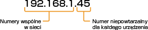 Adres IP składa się z czterech liczb oddzielonych kropką (.) (przykład: 192.168.1.45). Każda liczba musi mieścić się w przedziale z zakresu od 0 do 255. Zasadniczo pierwsze trzy liczby powinny być takie same, jak dla routera, ponieważ są one wspólne w sieci. Ostatnia liczba (na przykład 45 w adresie 192.168.1.45) powinna być różna od liczby innych urządzeń.