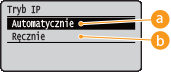 <Automatycznie>Opcję należy wybrać, aby włączyć automatyczne przypisywanie adresu IP za pośrednictwem protokołu, takiego jak DHCP.