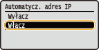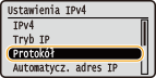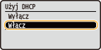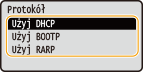 3 | Wybierz opcję <Użyj DHCP>, <Użyj BOOTP> lub <Użyj RARP> i naciśnij przycisk . Można użyć tylko jednego z protokołów: DHCP, BOOTP i RARP. Jeśli ustawienie wybranego protokołu to <Włącz>, ustawienie dla pozostałych dwóch protokołów zostanie zmienione na <Wyłącz>. |