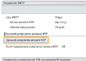 Sprawdzanie komunikacji z serwerem NTP/SNTPStatus komunikacji z zarejestrowanym serwerem można wyświetlić, klikając [Ustawienia/Rejestracja]  [Sieć]  [Ustawienia TCP/IP], a następnie klikając przycisk [Sprawdź połączenie serwera NTP] w wyświetlonej sekcji [Ustawienia SNTP]. W przypadku prawidłowego połączenia wyświetlony wynik będzie podobny do przedstawionego poniżej. Należy pamiętać, że ta czynność nie zmienia ustawień zegara systemowego. Wybieranie ustawień z panelu sterowaniaUstawienia SNTP można również włączać lub wyłączać z poziomu menu ustawień panelu roboczego. SNTP |