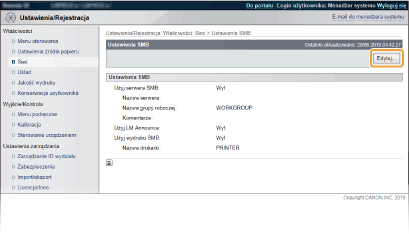 Protokół SMB obsługuje wyłącznie szyfrowanie NetBIOS na TCP/IP i nie obsługuje NetBEUI. Przed skonfigurowaniem ustawień protokołu SMB należy skonfigurować adres IP. Konfiguracja adresu IPProtokół SMB jest włączony tylko wówczas, gdy w urządzeniu zainstalowana jest opcjonalna karta SD. |