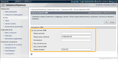 Nazwa grupy roboczej ustawiona w opcji [Nazwa grupy roboczej SMB] dostępnej pod pozycją [Konfiguracja WINS] zostanie automatycznie użyta jako [Nazwa grupy roboczej], jeśli jest ona dostępna. Zmiana nazwy serwera wprowadzona w opcji [Nazwa grupy roboczej] zostanie zastosowana również do ustawienia [Nazwa grupy roboczej SMB] dostępnego pod pozycją [Konfiguracja WINS].
