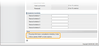 Zaznaczenie tego pola wyboru spowoduje, że aplikacje korzystające z protokołu SNMP, takie jak aplikacje z serii oprogramowania imageWARE firmy Canon, mogą być wyłączone w celu umożliwienia dostępu do urządzenia.