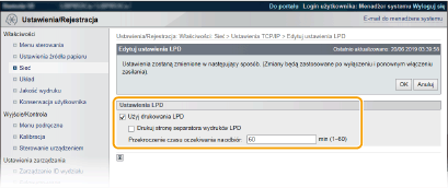 2 | Skonfiguruj odpowiednio ustawienia. ![]() [Użyj drukowania LPD] Korzystając z protokołu LPD do drukowania, należy zaznaczyć to pole wyboru. Jeśli nie jest on używany, należy usunąć zaznaczenie tego pola. [Drukuj stronę separatora wydruków LPD] To pole wyboru należy zaznaczyć, aby uwzględnić takie informacje, jak nazwy użytkowników i nazwy plików na wydrukach. Aby te dane nie były drukowane, należy usunąć zaznaczenie tego pola wyboru. [Przekroczenie czasu oczekiwania na odbiór] Ustaw czas, po którym zadanie drukowania zostanie automatycznie zakończone, jeśli urządzenie nie będzie mogło odebrać danych drukowania z powodu problemów z komunikacją lub wystąpienia innych problemów. |