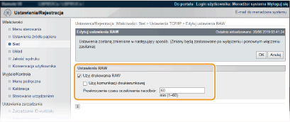 2 | Skonfiguruj odpowiednio ustawienia. ![]() [Użyj drukowania RAW] Zaznacz to pole wyboru w przypadku drukowania w trybie RAW. Jeśli funkcja ta nie jest używana, zaznaczenie tego pola wyboru należy usunąć. [Użyj komunikacji dwukierunkowej] To pole wyboru należy zaznaczyć, aby móc korzystać z komunikacji dwukierunkowej do powiadamiania komputera o stanie urządzenia i ukończeniu drukowania. Jeśli ta funkcja nie jest używana, należy usunąć zaznaczenie tego pola. [Przekroczenie czasu oczekiwania na odbiór] Ustaw czas, po którym zadanie drukowania zostanie automatycznie zakończone, jeśli urządzenie nie będzie mogło odebrać danych drukowania z powodu problemów z komunikacją lub wystąpienia innych problemów. |