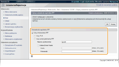 2 | Skonfiguruj odpowiednio ustawienia. ![]() [Użyj drukowania IPP] Korzystając z protokołu IPP/IPPS do drukowania, należy zaznaczyć to pole wyboru. Jeśli nie jest on używany, należy usunąć zaznaczenie tego pola. [Użyj TLS] Korzystając z protokołu IPP/IPPS (drukowanie IPP z zaszyfrowaną komunikacją TLS) przy drukowaniu, należy zaznaczyć to pole wyboru. Jeśli nie jest on używany, należy usunąć zaznaczenie tego pola. ![]() Gdy używany jest protokół IPPS, należy włączyć funkcję komunikacji szyfrowanej TLS. Korzystanie z protokołu TLS do komunikacji szyfrowanej ![]() Jeśli podczas generowania klucza używanego na potrzeby komunikacji sieciowej wybrane zostanie ustawienie [RSA] dla opcji [Algorytm klucza], jako długość klucza należy skonfigurować co najmniej wartość [1024 bity]. Zależnie od używanego systemu operacyjnego drukowanie IPPS może nie zostać przeprowadzone poprawnie, jeśli jako długość klucza zostanie podana wartość [512 bitów]. [Użyj uwierzytelniania IPP] Aby skorzystać z funkcji uwierzytelniania użytkownika na potrzeby drukowania IPP, należy zaznaczyć to pole wyboru i ustawić nazwę użytkownika oraz hasło. Jeśli nie jest ona używana, należy usunąć zaznaczenie tego pola. [Nazwa użytkownika] Należy wprowadzić złożoną ze znaków alfanumerycznych nazwę użytkownika używaną do uwierzytelniania IPP. [Ustaw/Zmień hasło] Aby określić lub zmienić hasło, należy zaznaczyć pole wyboru i wprowadzić złożone ze znaków alfanumerycznych hasło w polu tekstowym [Hasło]. W celu potwierdzenia należy wprowadzić to samo hasło w polu tekstowym [Potwierdź]. |
