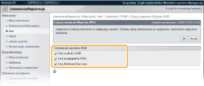 2 | Skonfiguruj odpowiednio ustawienia. ![]() [Użyj wydruku WSD] Korzystając z protokołu WSD do drukowania, należy zaznaczyć to pole wyboru. Jeśli nie jest on używany, należy usunąć zaznaczenie tego pola. [Użyj przeglądania WSD] Zaznaczenie tego pola wyboru umożliwia uzyskanie informacji o urządzeniu przez komputer za pomocą interfejsu WSD. To pole wyboru jest zaznaczane automatycznie po zaznaczeniu pola wyboru [Użyj wydruku WSD]. [Użyj Multicast Discovery] Zaznaczenie tego pola wyboru umożliwia skonfigurowanie urządzenia tak, aby odpowiadało na komunikaty Multicast Discovery. Gdy pole wyboru nie jest zaznaczone, urządzenie pozostaje w trybie uśpienia nawet pomimo przepływu w sieci komunikatów Multicast Discovery. |