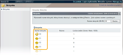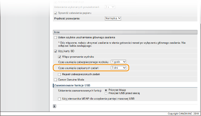 Zgodnie z ustawieniem domyślnym dane zapisane na karcie pamięci SD zostaną automatycznie usunięte po upływie określonego czasu i nie będzie można już ich wydrukować. Aby zmienić czas, przez jaki dokumenty pozostają na karcie pamięci SD lub zapobiec ich automatycznemu usuwaniu, należy dostosować ustawienia w Remote UI (Zdalny interfejs użytkownika). Zapisane dokumenty można również usunąć ręcznie.