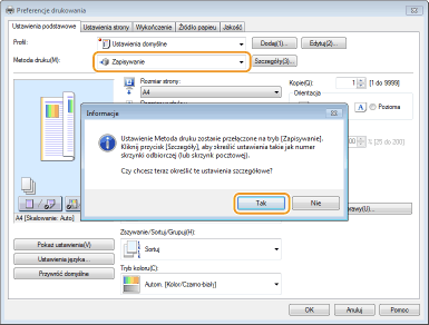 Wybierz [Zapisywanie] w sekcji [Metoda druku] i kliknij [Tak].