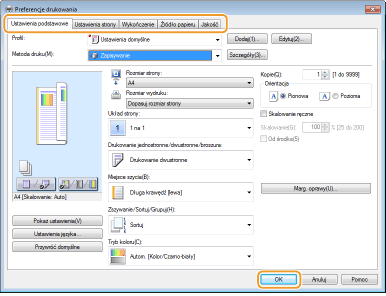 Wprowadzone w tym miejscu zmiany w ustawieniach są zapisywane wraz z dokumentem. Kolejne drukowanie dokumentu będzie przebiegało zgodnie z zapisanymi ustawieniami.