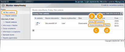 Istnieje możliwość sprawdzenia stanu drukowania (w trakcie drukowania lub oczekujące na drukowanie) dokumentów wskazanych do wydrukowania za pomocą komputera, a także usunięcia lub przerwania dokumentów.