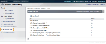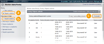 Historia drukowania i historia odbierania wiadomości e-mail są wyświetlane w formie listy.
