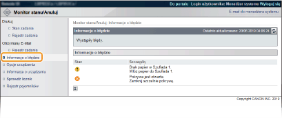 Jeśli wystąpi błąd, po kliknięciu komunikatu wyświetlonego w części [Informacje o błędzie] na stronie portalu (stronie głównej) zostanie wyświetlona ta strona.