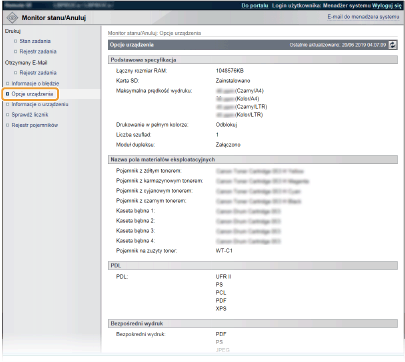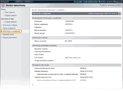 Wyświetlane są informacje o urządzeniu oraz menedżerze systemu. Informacje te odpowiadają informacjom ustawionym w części [Zabezpieczenia]