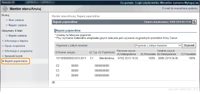 Sprawdzanie historii zasobników z tonerem/zespołów bębna