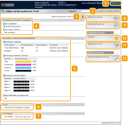Są tu wyświetlane informacje o papierze (liczba pozostałych arkuszy, format itd.) oraz stanie zasobników z tonerem i innych materiałów eksploatacyjnych.